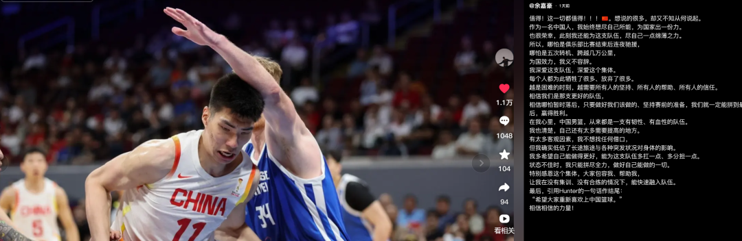 看到余嘉豪在社交媒体发的动态以后,作为一个普普通通的中国男篮球迷,有一些感受想要抒发。